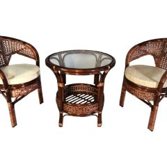 Комплект мебели Пеланги 02/15 включает в себя: 2 кресла и столик с красивым плетением снизу и полочкой, съемные подушки из материала улучшенного качества.