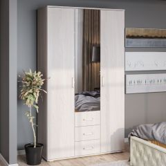 Трёхстворчатый шкаф "Белла" станет незаменимым помощником в хранении ваших вещей. Модель имеет отделение с хромированной штангой для одежды на вешалках, три выдвижных ящика, а также зону с полками. На центральный фасад прикреплено высокое зеркало.